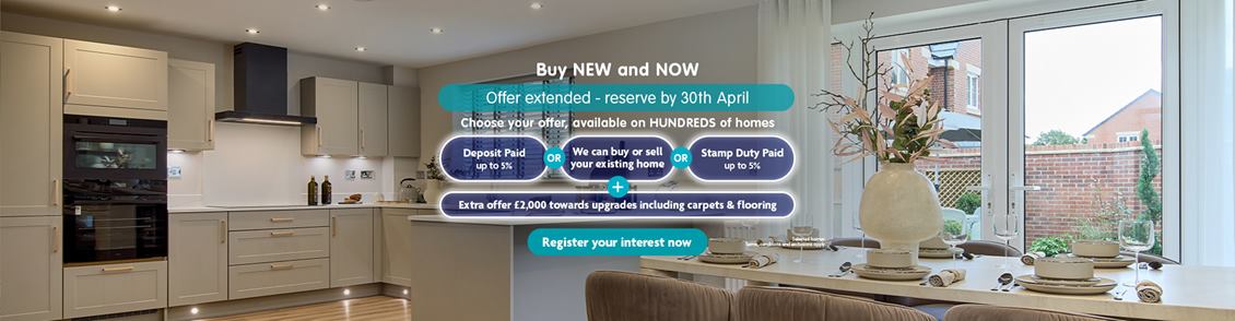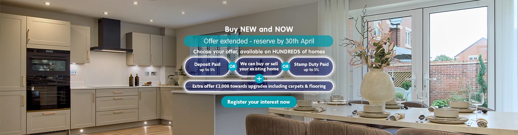 We’re here to turn your ‘one day’ dreams into ‘right now’ reality. On hundreds of homes, you can choose from up to 5% towards your deposit, or Stamp Duty*, or we can buy or sell your existing home with our Part Exchange† or Assisted Move option^. Plus, an additional £2,000 towards upgrades if you reserve by 30th April‡. So, get moving. Register your interest todayTerms and conditions apply.